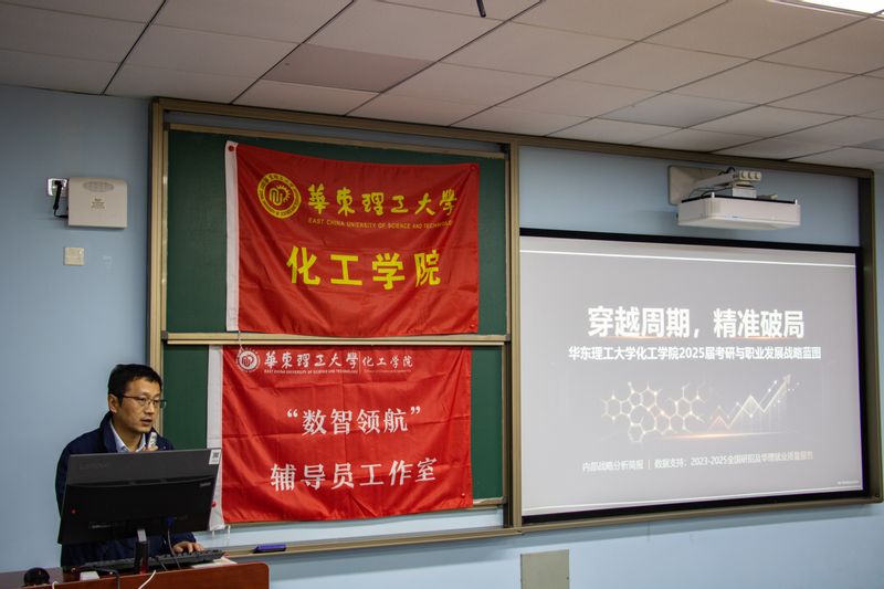 凌昊结合当前全国考研形势与化工学科发展趋势,以“穿越周期,精准破局”为主题,结合2023-2025年全国研招情况和华理就业质量报告,为学院同学详细分析当前研究生招考的发展趋势和重点专业类别,并提醒同学们避开二战、盲目考公等低胜率陷阱,建议采用“考研+秋招”双轨并行的破局策略,理性计算各方面资源的投入产出,合理做好未来的发展规划。